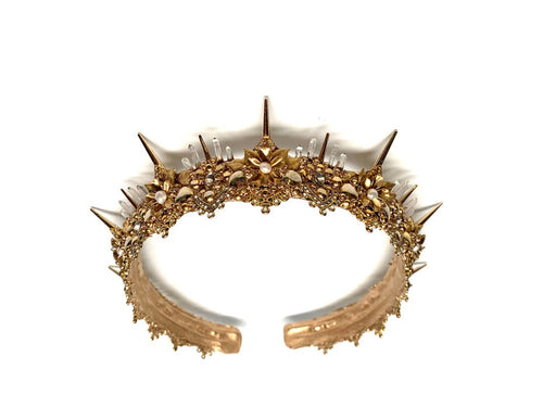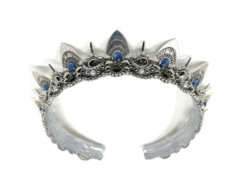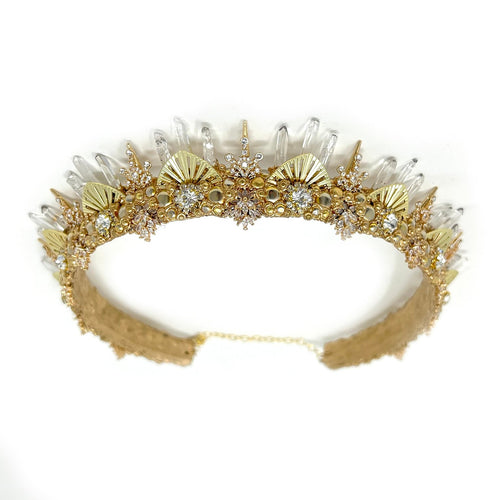 Each handcrafted crown holds all the drama of two star crossed lover's tales. Crystal clear quartz points catch the sunlight so you can spend all your time catching the eye of your beloved. Romantic rubies, sultry sapphires and tempting topaz all have their moment to shine in this this congregations of treasures.